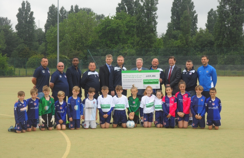 The Minister for Sport and MP for Bexleyheath and Crayford, Rt Hon David Evennett, has presented Danson Sports FC with a cheque for £459,486 for a new floodlit 3G artificial grass pitch.